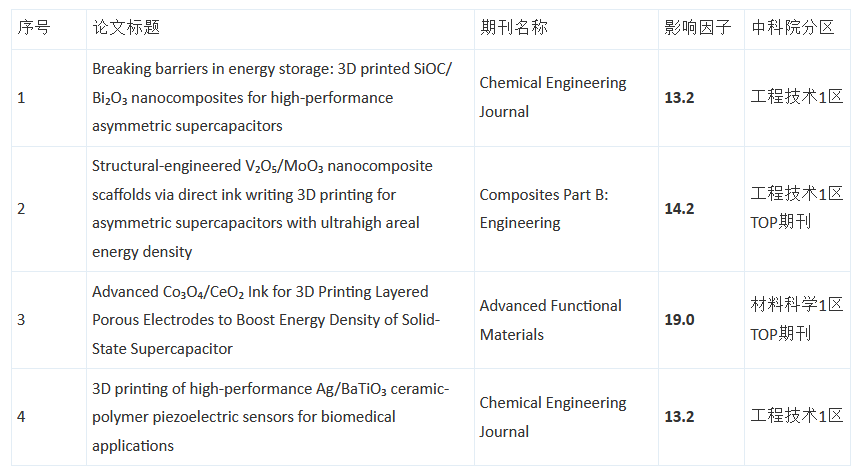 陳張偉老師團隊的 4 項研究圍繞 “3D 打印功能材料 - 器件性能優(yōu)化 - 實際場景應用” 展開,覆蓋超級電容器、壓電傳感器等關鍵領域,每篇論文均以 AutoBio2000 設備為核心制備工具,突破傳統(tǒng)材料成型局限,以下是詳細解讀: