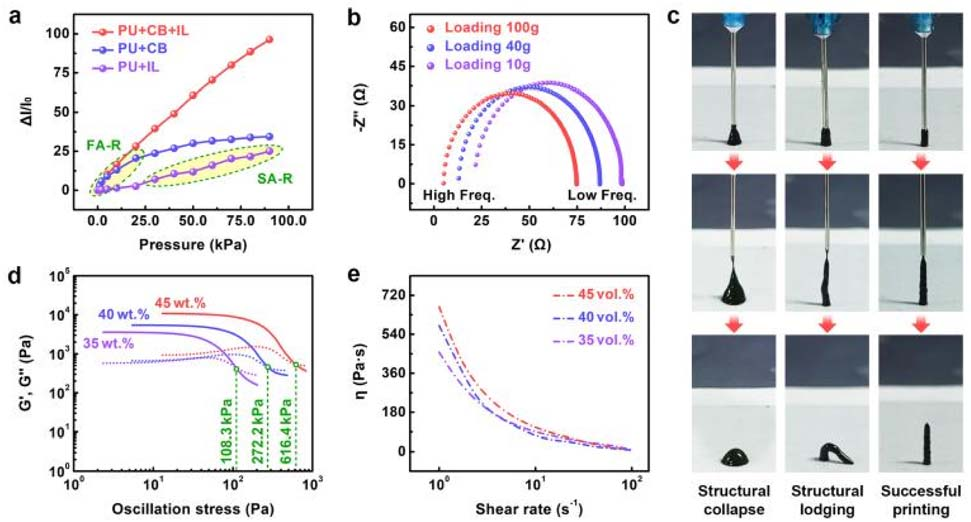 圖1:不同材料制成的薄膜的特性以及微纖毛的打印工藝。(a) 不同材料制成的薄膜在壓力下的電響應(yīng)。(b) 由PU、CB和IL制成的薄膜在不同加載條件下的阻抗奈奎斯特圖。(c) 不同油墨垂直3D打印微纖毛過(guò)程中關(guān)鍵時(shí)刻的照片。從左到右,油墨的CB含量分別為35 wt%、40 wt%和45 wt%。(d) 三種油墨樣品的流變特性。實(shí)線和虛線分別代表儲(chǔ)能模量(G')和損耗模量(G'')。(e) 油墨樣品的表觀粘度(h)與剪切速率的函數(shù)關(guān)系