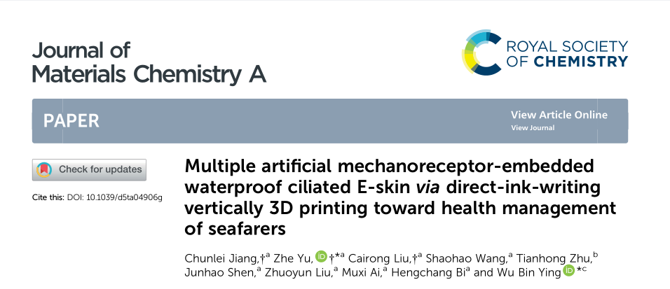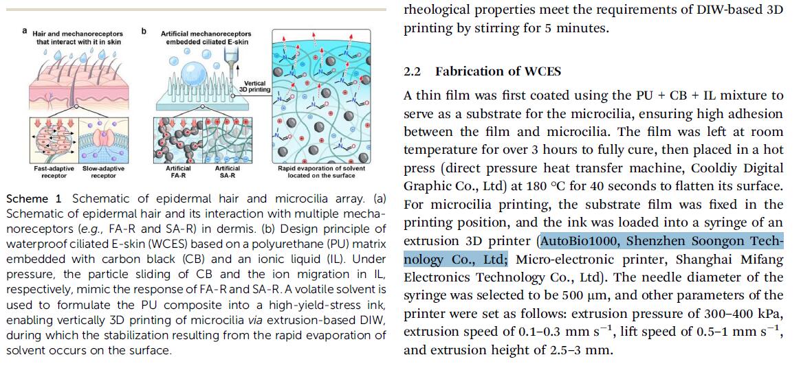 近日,華東師范大學(xué)通信與電子工程學(xué)院/集成電路學(xué)院郁哲助理研究員與韓國(guó)科學(xué)技術(shù)院(KAIST)應(yīng)鄔彬副教授在材料科學(xué)領(lǐng)域國(guó)際頂級(jí)期刊《Journal of Materials Chemistry A》發(fā)表題為 “Multiple artificial mechanoreceptor-embedded waterproof ciliated E-skin via direct-ink-writing vertically 3D printing toward health management of seafarers” 的高水平研究論文(DOI: 10.1039/d5ta04906g)。在該研究中,森工科技研發(fā)生產(chǎn)的AutoBio1000 3D打印機(jī)高效的完成了高縱橫比微纖毛的垂直 3D 打印制備環(huán)節(jié),為新型防水纖毛電子皮膚(WCES)的性能突破提供了核心技術(shù)支撐。