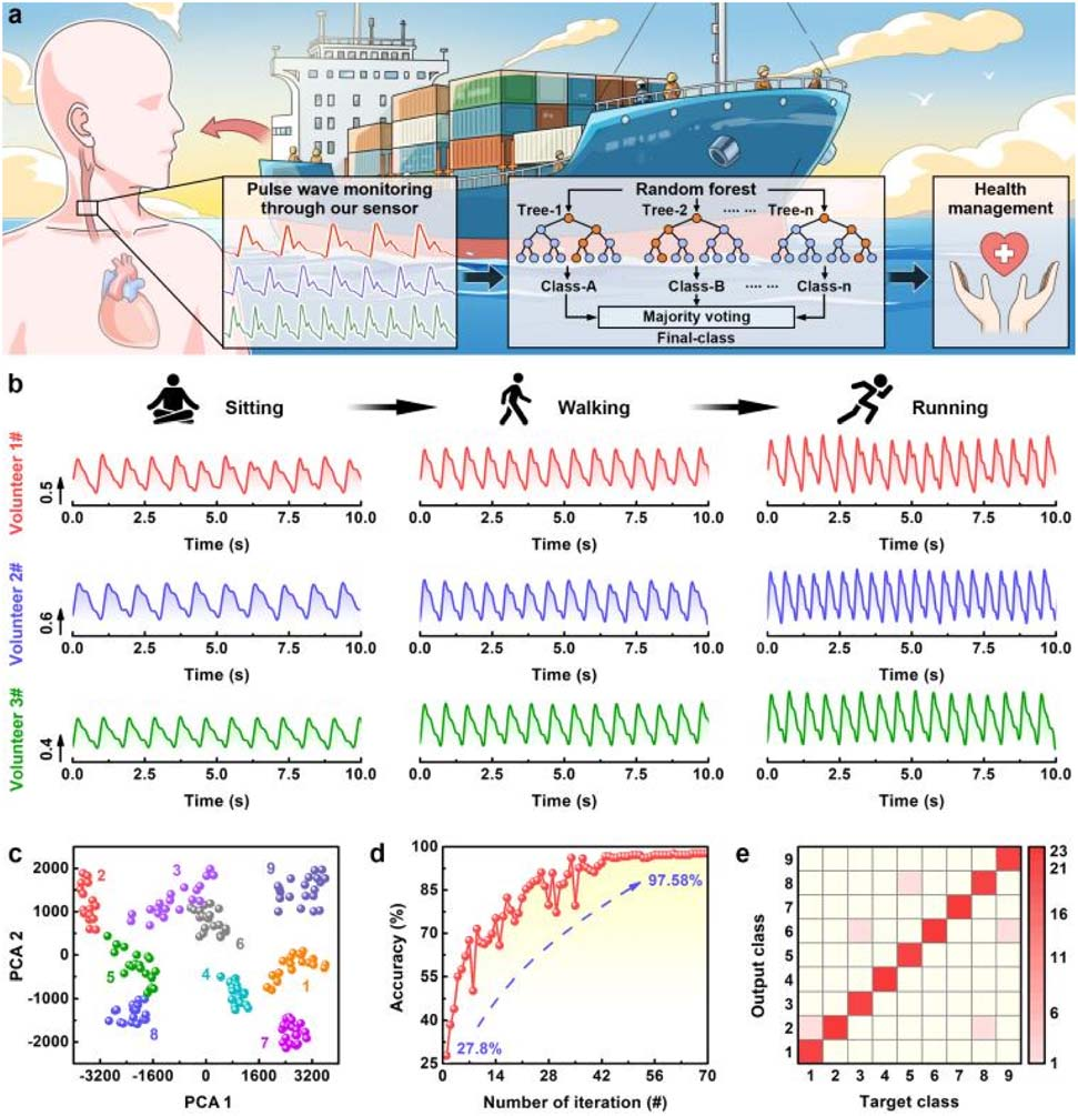 基于 AutoBio1000 制備的 WCES,團(tuán)隊(duì)進(jìn)一步構(gòu)建了船員健康管理系統(tǒng):在 80% 相對(duì)濕度環(huán)境中,將 WCES 貼附于頸動(dòng)脈處,可清晰捕捉脈搏信號(hào)(含 3 個(gè)特征峰),并結(jié)合隨機(jī)森林(RF)機(jī)器學(xué)習(xí)模型對(duì)不同生理狀態(tài)(靜坐、行走、慢跑)下的脈搏信號(hào)進(jìn)行分類(lèi),識(shí)別準(zhǔn)確率高達(dá) 97.58%。
