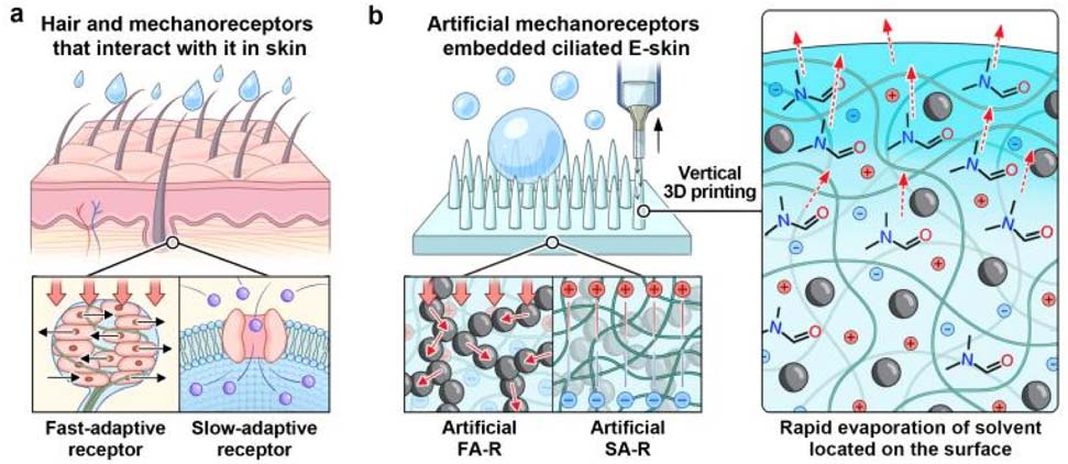全球 80% 以上的跨境貿(mào)易依賴海運(yùn),船員長(zhǎng)期處于密閉、高濕的船舶環(huán)境中,易出現(xiàn)血壓異常、循環(huán)障礙、自主神經(jīng)系統(tǒng)功能紊亂等健康問(wèn)題。然而,傳統(tǒng)可穿戴傳感器在高濕環(huán)境下常因濕氣會(huì)引起信號(hào)不穩(wěn)定,難以實(shí)現(xiàn)持續(xù)生理監(jiān)測(cè);現(xiàn)有防水型電子皮膚(E-skin)又多存在靈敏度低、制備復(fù)雜等瓶頸,無(wú)法滿足海事場(chǎng)景的實(shí)用需求。為解決這一痛點(diǎn),華師大&韓國(guó)KAIST團(tuán)隊(duì)創(chuàng)新性地從人體皮膚表皮毛發(fā)與機(jī)械感受器的結(jié)構(gòu)功能中汲取靈感,提出 “垂直 3D 打印微纖毛 + 嵌入式人工機(jī)械感受器” 的協(xié)同設(shè)計(jì)方案,而森工 AutoBio1000 3D打印機(jī)憑借精準(zhǔn)的擠出控制與工藝兼容性,成為實(shí)現(xiàn)這一設(shè)計(jì)的關(guān)鍵設(shè)備支撐。