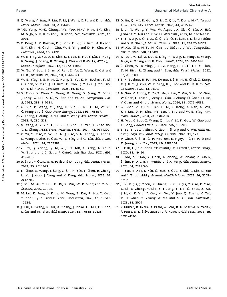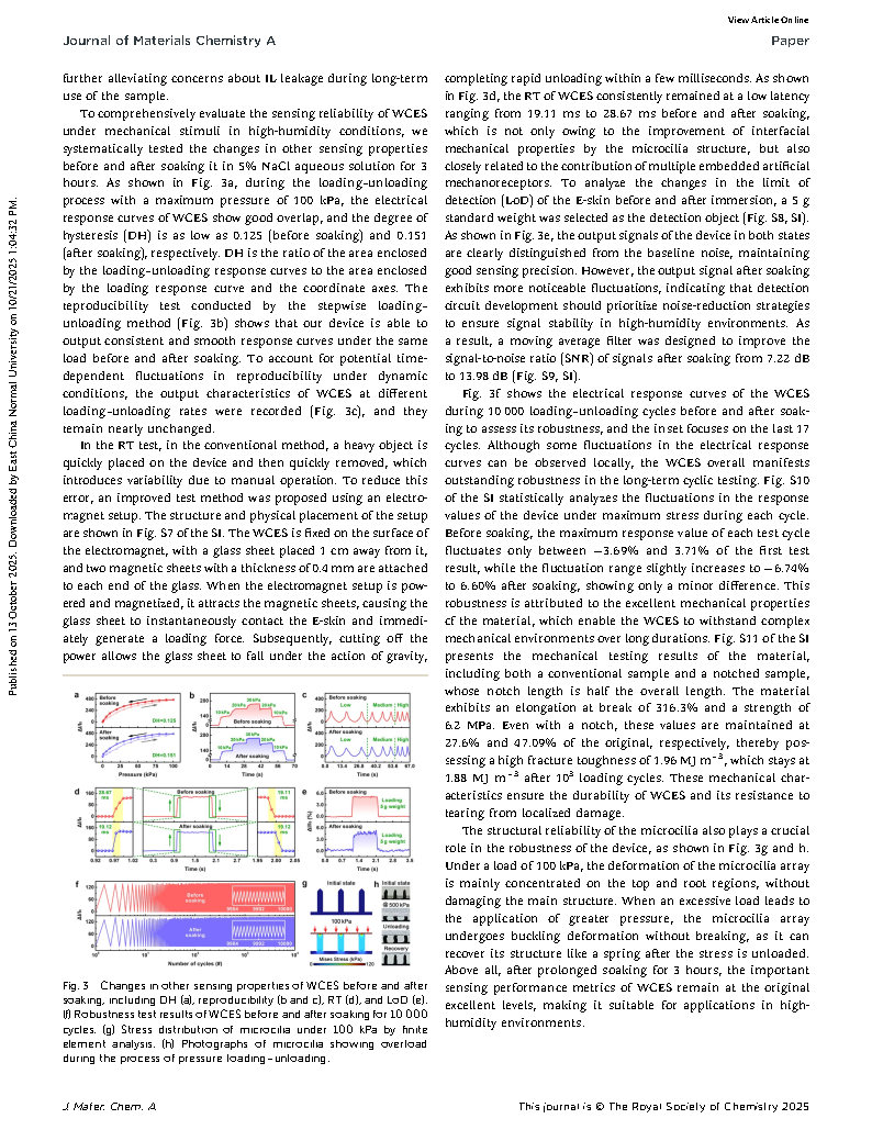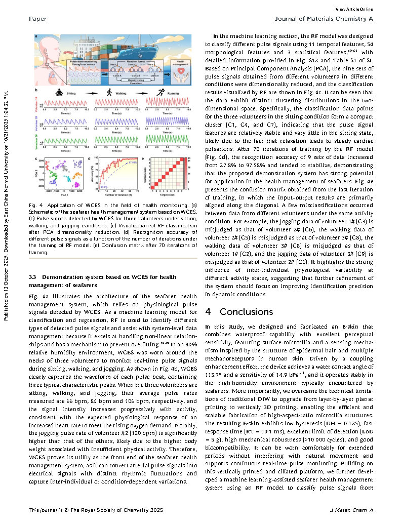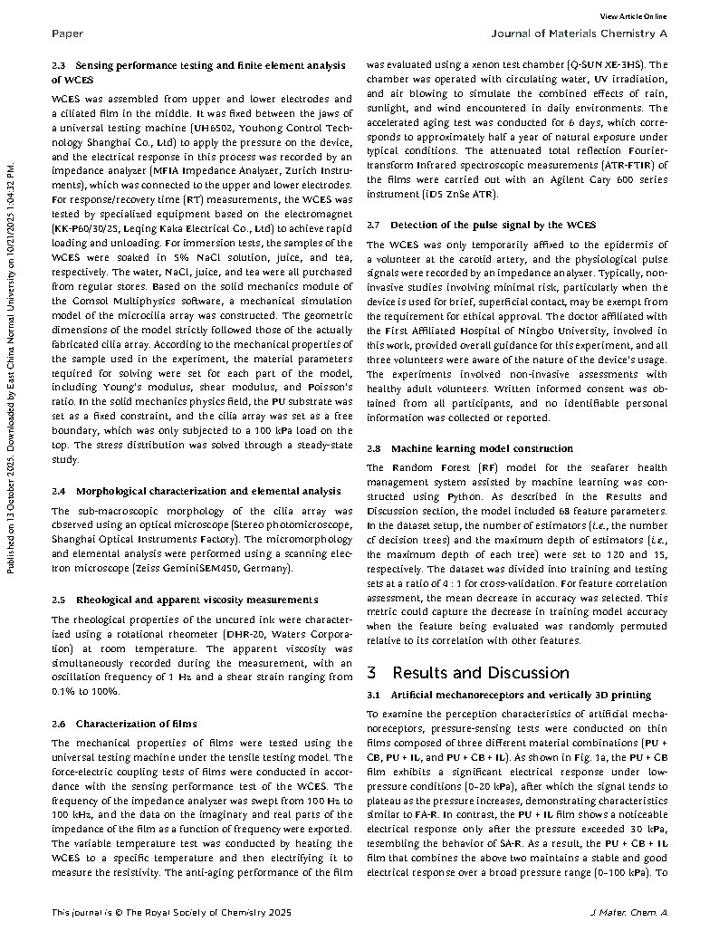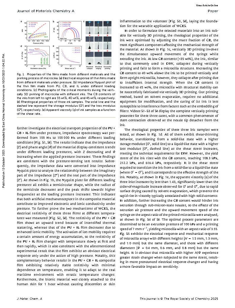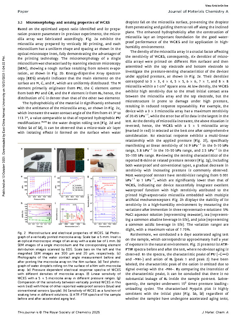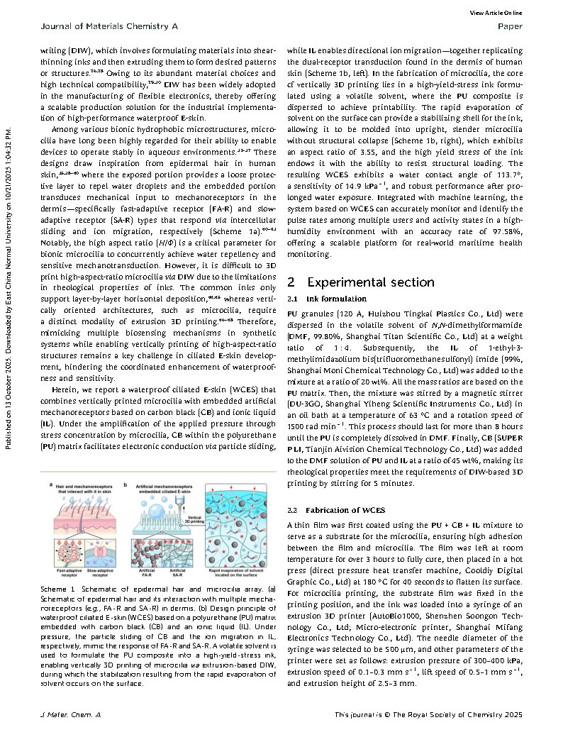 華東師范大學(xué)通信與電子工程學(xué)院/集成電路學(xué)院郁哲助理研究員與韓國科學(xué)技術(shù)院(KAIST)應(yīng)鄔彬副教授在材料科學(xué)領(lǐng)域國際頂級期刊《Journal of Materials Chemistry A》發(fā)表題為 “Multiple artificial mechanoreceptor-embedded waterproof ciliated E-skin via direct-ink-writing vertically 3D printing toward health management of seafarers” 的高水平研究論文(DOI: 10.1039/d5ta04906g)。在該研究中,森工科技研發(fā)生產(chǎn)AutoBio1000 3D打印機(jī)高效的完成了高縱橫比微纖毛的垂直 3D 打印制備環(huán)節(jié),為新型防水纖毛電子皮膚(WCES)的性能突破提供了核心技術(shù)支撐。