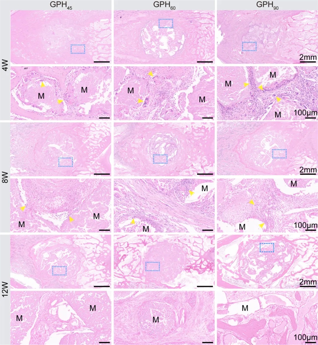 H&E染色結(jié)果顯示,GPH支架具有良好生物相容性,植入體內(nèi)12周無(wú)炎癥反應(yīng),并且可觀察到明顯的支架降解(圖7)。