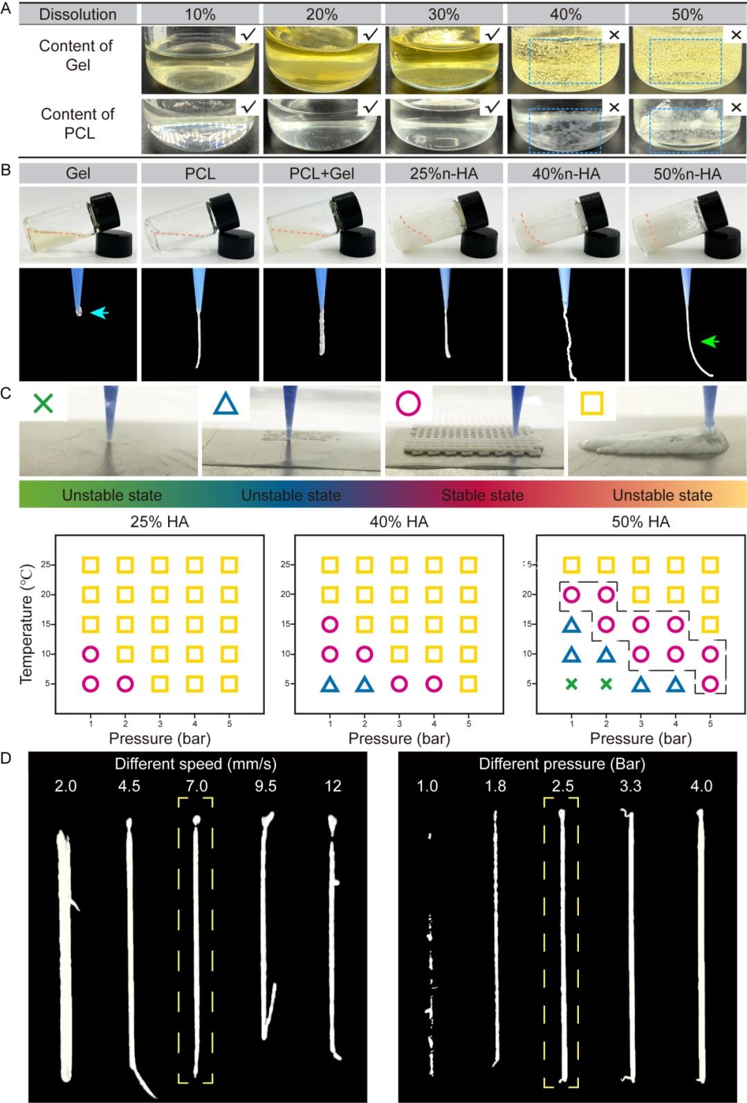 在這項(xiàng)研究中,研究者首先采用冰乙酸作為溶劑,分別溶解不同濃度的Gel和PCL。隨后將優(yōu)選的最適濃度的兩種溶液混合并加入n-HA攪拌均勻,得到了3D打印復(fù)合生物材料墨水,并對(duì)墨水的打印性進(jìn)行分析,篩選合適的打印條件。n-HA含量50% (w/w),打印溫度10–15 °C,打印氣壓2.5 bar,打印速度7 mm/s,為Gel/PCL/n-HA 3D打印墨水的最佳打印條件(圖2)。