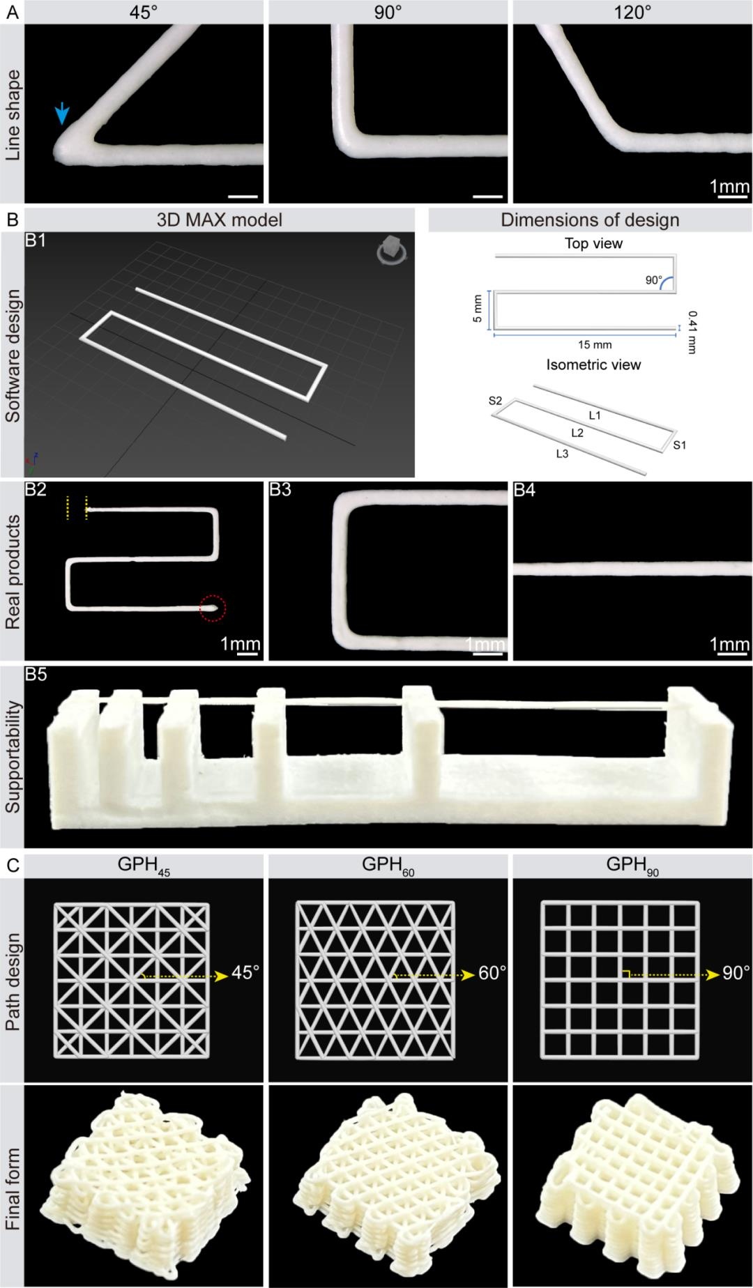 Gel/PCL/n-HA 3D打印生物材料墨水可以打印出多種角度的曲線,并且出絲平滑、均勻,具有很高的保真度和優(yōu)異的自支撐性。之后通過(guò)Perfactory RP軟件設(shè)計(jì)了三種不同的二維打印路徑,通過(guò)擠出式3D打印技術(shù)逐層打印,獲得不同結(jié)構(gòu)的Gel/PCL/n-HA復(fù)合支架(GPH支架),分別命名為GPH45 (0°/45°/90°/135°),GPH60 (0°/60°/120°),GPH90 (0°/90°)(圖3)。
