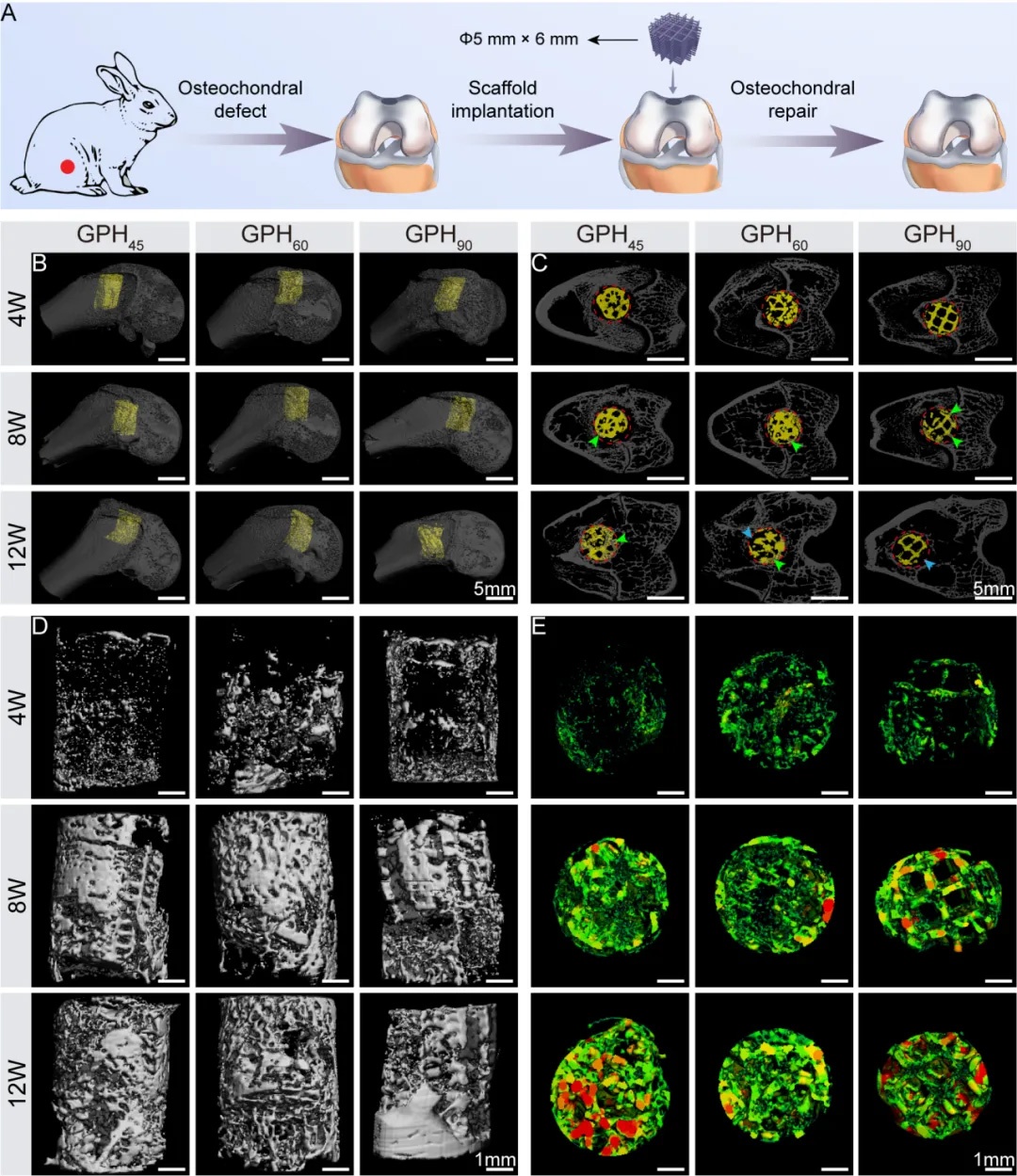 通過(guò)兔股骨滑車溝骨缺損模型,將三種不同結(jié)構(gòu)的支架植入缺損區(qū)域,觀察4周,8周和12周的骨再生和體內(nèi)支架降解情況。Micro-CT分析結(jié)果顯示,術(shù)后4周,新生骨組織僅在支架周圍形成薄層;8周時(shí),新骨增多并且從支架外圍沿著支架向內(nèi)延伸;到第12周時(shí),新生骨組織明顯增厚。支架隨著植入時(shí)間的延長(zhǎng),逐漸降解。降解過(guò)程中仍能較好保持三維多孔結(jié)構(gòu)(圖6)。