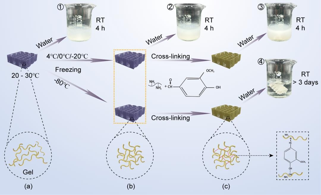 GPH支架展現(xiàn)出良好的三維多孔結(jié)構(gòu),但在室溫空氣環(huán)境下會(huì)逐漸坍塌。將GPH支架分別在不同溫度下(4 °C,0 °C,-20 °C,-80 °C)冷凍12 h后取出,浸泡于去離子水中,發(fā)現(xiàn)支架坍塌。對(duì)不同溫度冷凍固化后的支架進(jìn)行化學(xué)交聯(lián)以增強(qiáng)其穩(wěn)定性。交聯(lián)后,常溫下支架放入去離子水中,經(jīng)4 °C、0 °C和-20 °C冷凍的支架仍在水中坍塌,-80 °C冷凍交聯(lián)后的支架可保持長(zhǎng)期的穩(wěn)定性。