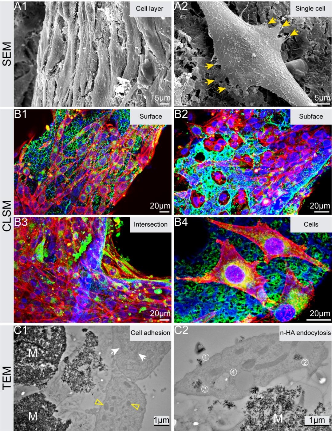 將GPH支架與MG63細(xì)胞共培養(yǎng),對(duì)GPH支架的細(xì)胞相容性進(jìn)行表征。SEM和CLSM結(jié)果均顯示細(xì)胞在支架表面黏附生長(zhǎng)良好。TEM結(jié)果顯示,MG63細(xì)胞緊密黏附在支架表面,支架中的n-HA釋放后經(jīng)胞吞作用進(jìn)入細(xì)胞中(圖5)。